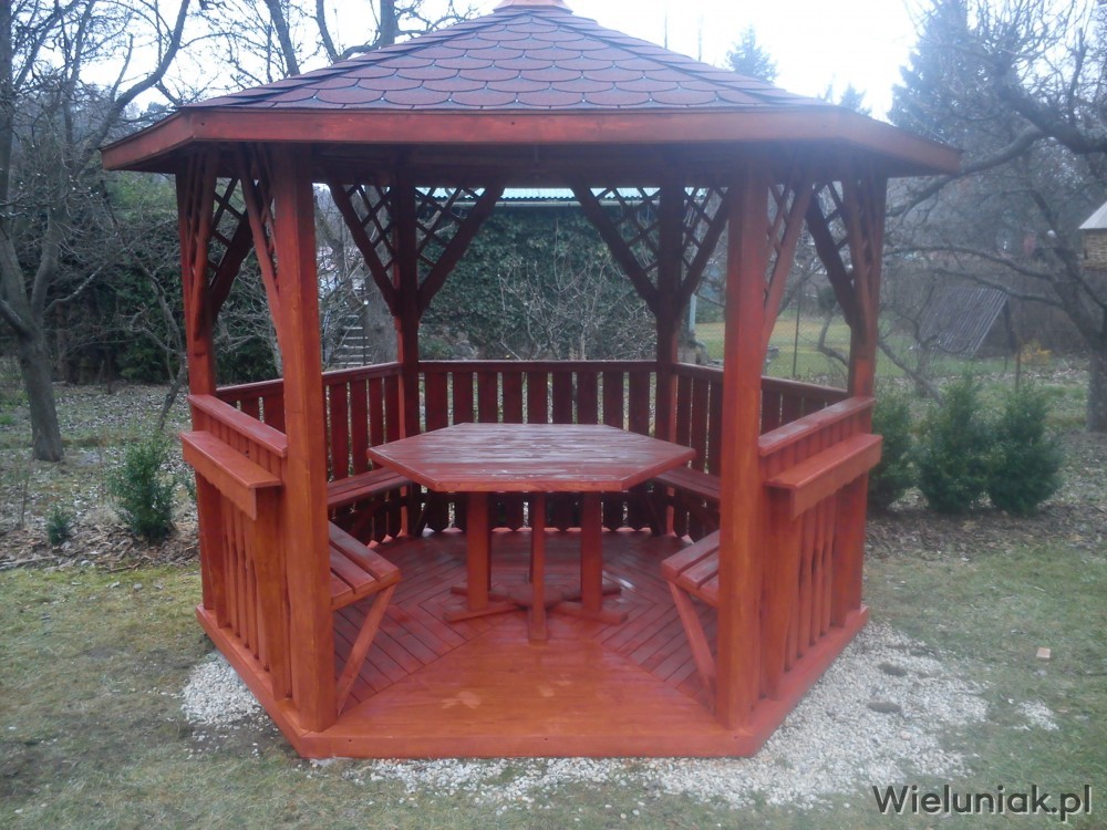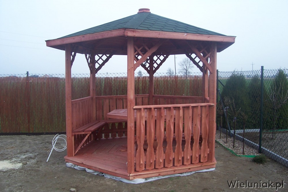 Altany ogrodowe wykonywane są z drewna sosnowego. Każda altana drewniana jest ustawiana na odpowiednio rozmieszczonych i wypoziomowanych podkładach betonowych, które zabezpieczają przed gromadzeniem się wody pod podłogą altany i zapewniają cyrkulację powietrza pod podłogą. Stosujemy również agrowłókninę, której zadaniem jest zapobieganie przerastaniu roślinności między deskami podłogowymi. Słupy altany mają wysokość 200 cm, natomiast całkowita wysokość altany wynosi 270 cm. Dachy altan wykonane są z desek boazeryjnych oraz pokryte gontem bitumicznym co zapewnia długoletnią trwałość każdej altany oraz odpowiednie wrażenia estetyczne. Każda z altan wyposażona jest w zestaw mebli, na który składają się stół z sześciokątnym blatem oraz 5 ławek, zamocowanych do altany. Wszystkie elementy altany są odpowiednio strugane oraz dwukrotnie impregnowane. Na życzenie klienta możemy zamontować w altanie oświetlenie oraz dodatkowe kratownice. Wszystkie altany montujemy samodzielnie. Dostarczamy nasze produkty na terenie Polski oraz zagranicę. Koszty transportu uzgadniamy indywidualnie z każdym klientem.