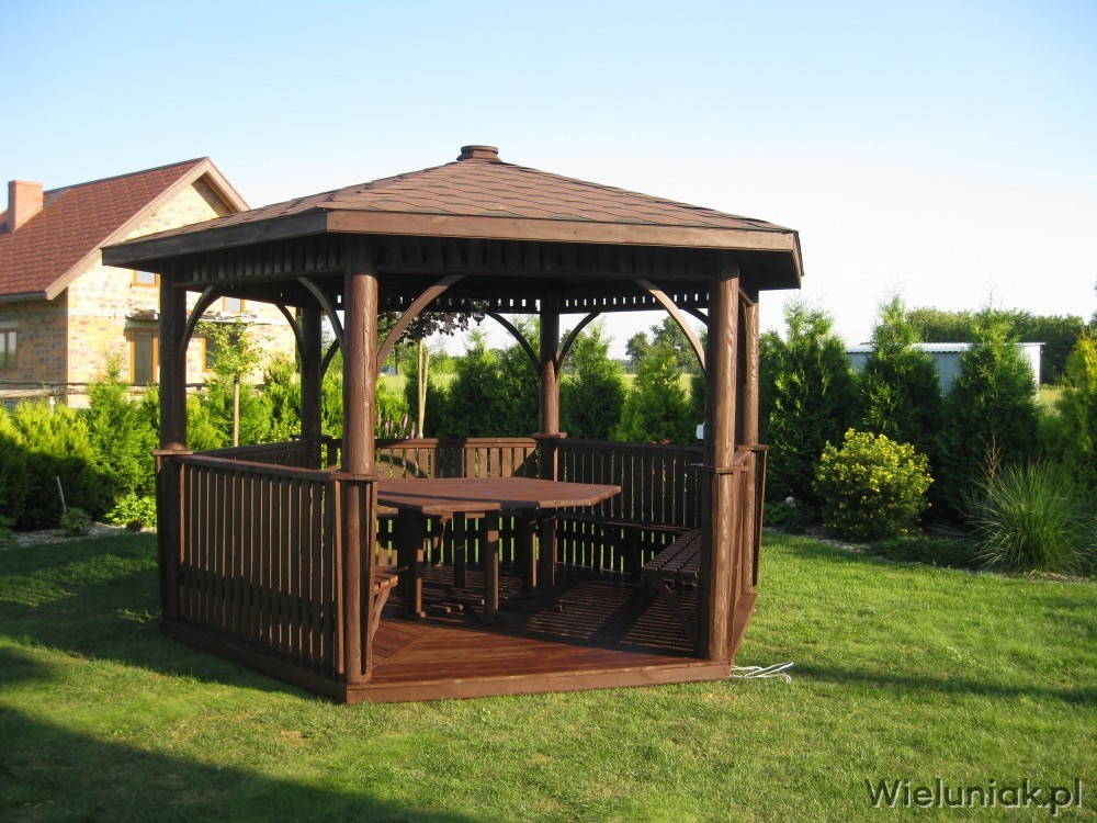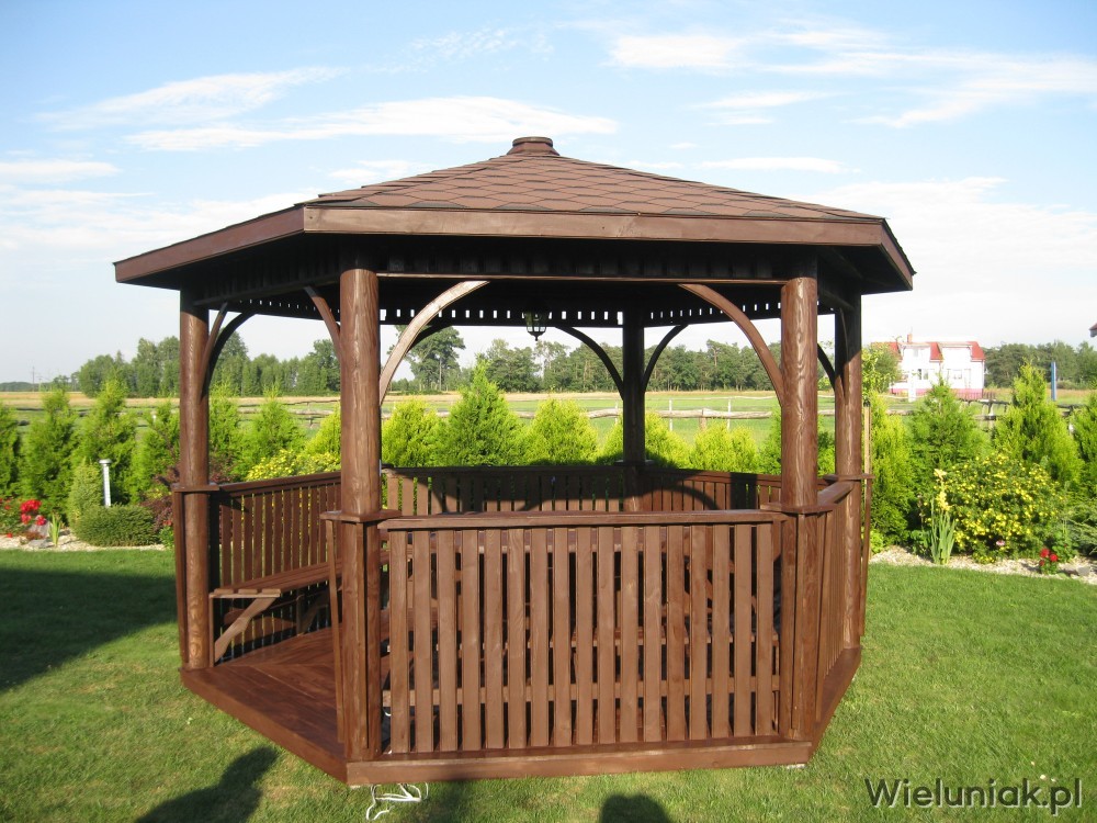 Altany ogrodowe wykonywane są z drewna sosnowego. Każda altana drewniana jest ustawiana na odpowiednio rozmieszczonych i wypoziomowanych podkładach betonowych, które zabezpieczają przed gromadzeniem się wody pod podłogą altany i zapewniają cyrkulację powietrza pod podłogą. Stosujemy również agrowłókninę, której zadaniem jest zapobieganie przerastaniu roślinności między deskami podłogowymi. Słupy altany mają wysokość 200 cm, natomiast całkowita wysokość altany wynosi 270 cm. Dachy altan wykonane są z desek boazeryjnych oraz pokryte gontem bitumicznym co zapewnia długoletnią trwałość każdej altany oraz odpowiednie wrażenia estetyczne. Każda z altan wyposażona jest w zestaw mebli, na który składają się stół z sześciokątnym blatem oraz 5 ławek, zamocowanych do altany. Wszystkie elementy altany są odpowiednio strugane oraz dwukrotnie impregnowane. Na życzenie klienta możemy zamontować w altanie oświetlenie oraz dodatkowe kratownice. Wszystkie altany montujemy samodzielnie. Dostarczamy nasze produkty na terenie Polski oraz zagranicę. Koszty transportu uzgadniamy indywidualnie z każdym klientem.