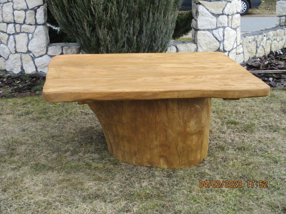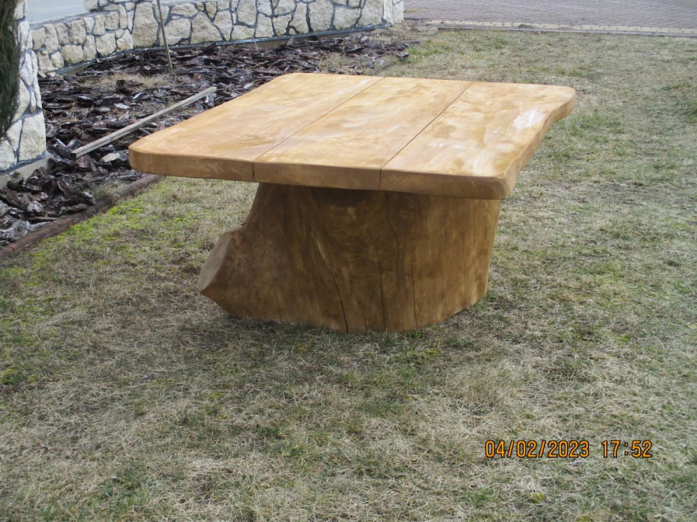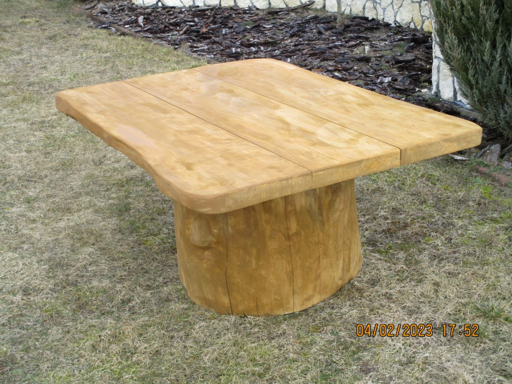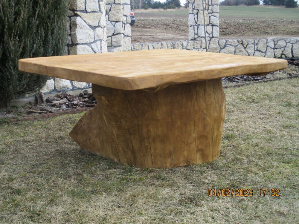 Stolik ogrodowy biesiadny wykonany jest z drewna liściastego o wymiarach 150 cm długości, 105 cm szerokości i 70 cm wysokości. Blat wykonany jest z deski grubości 6 cm, posadowiony jest na grubym pniu. Waga stolika wynosi ok 150 kg.