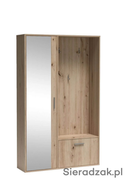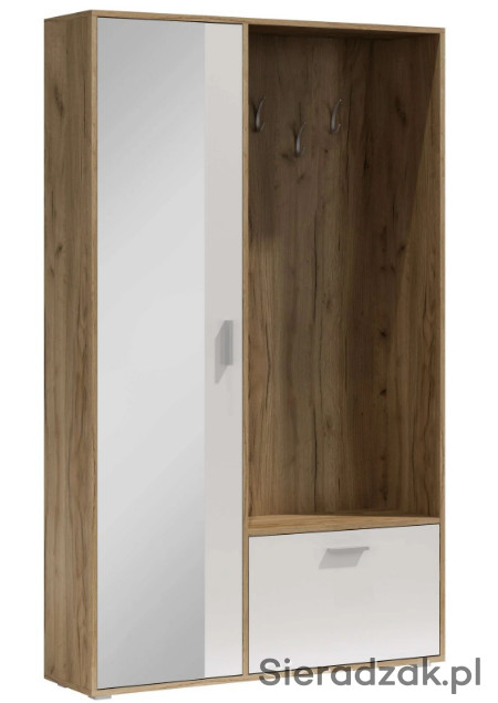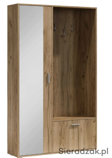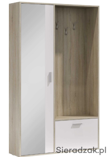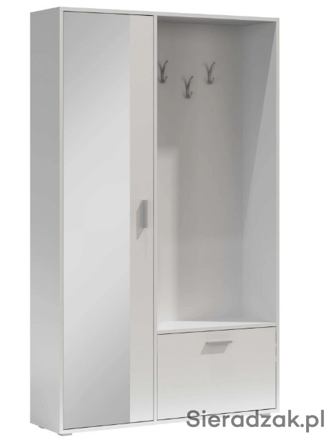 Garderoba z lustrem, oraz zabudowaniem BIS. Posiada na zewnętrznej stronie trzy wieszaki, idealne na kurtki, płaszcze czy bluzy i torebki. Poniżej znajduje się szafka na buty z przegrodą, co ułatwia organizacje. Szafa po lewej stronie posiada w sobie dwie półki. Jedną do góry a drugą na dole, pozwala to na umieszczenie na nich rzeczy, które wymagają położenia na płaskiej powierzchni. Nowoczesną opcją jest wysuwany wieszak, uwydatniający unikalność i funkcjonalność szafy. Dostępna w sześciu wybarwieniach.