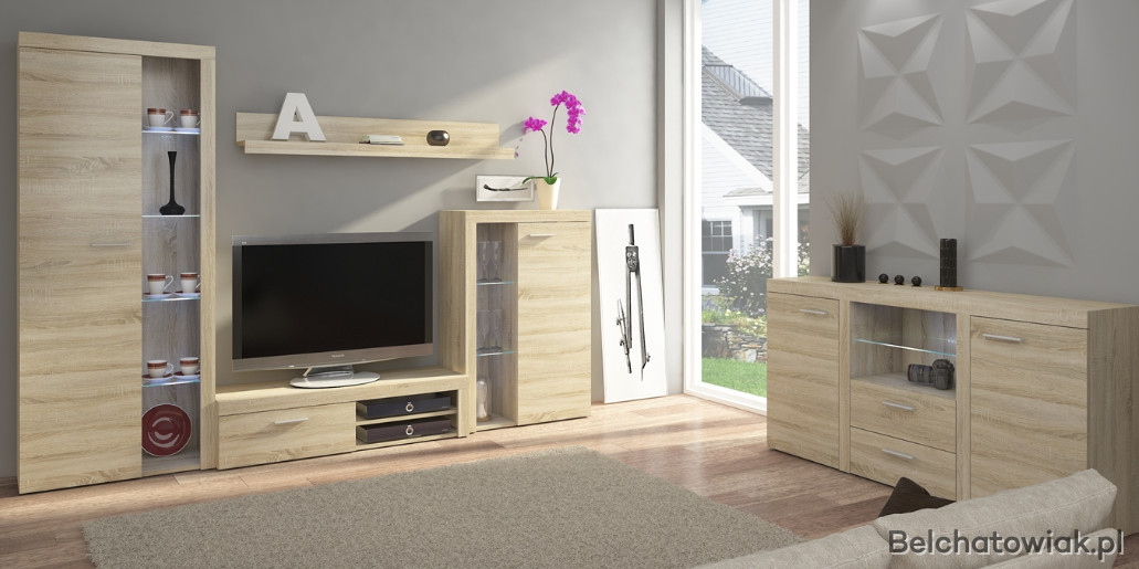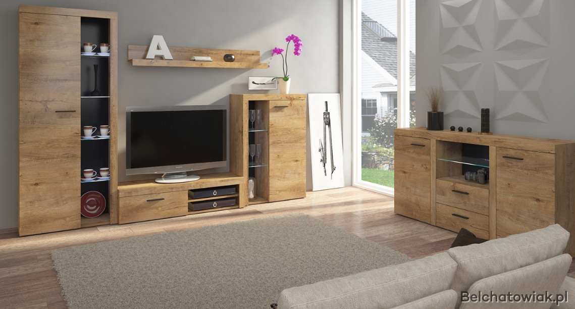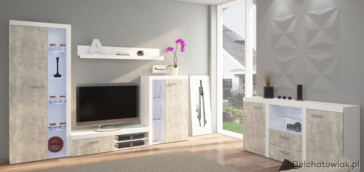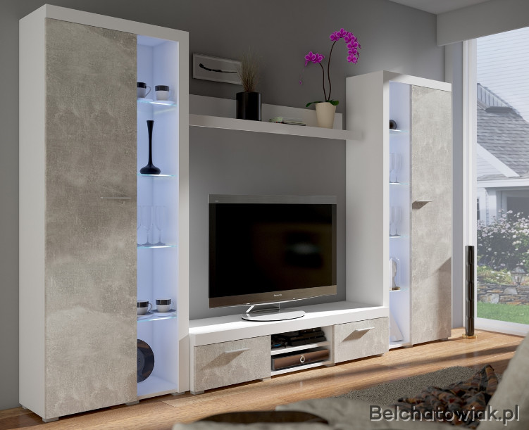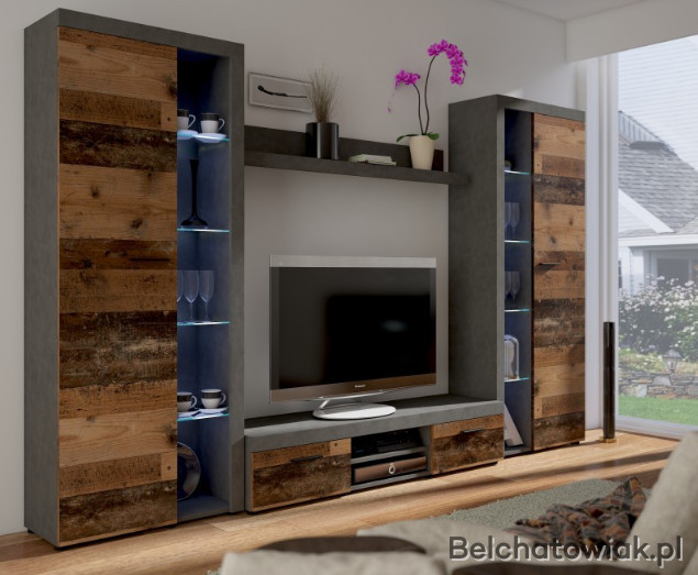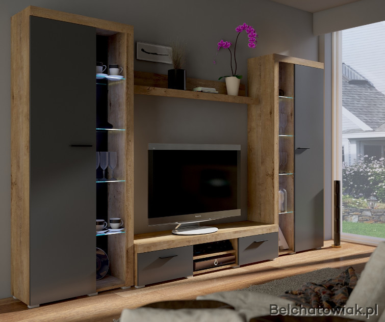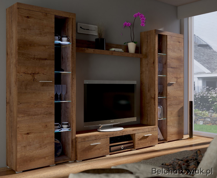 Meblościanka posiada otwarte szklane półki, które można podświetlić oświetleniem LED co jeszcze bardziej podkreśli charakter mebla