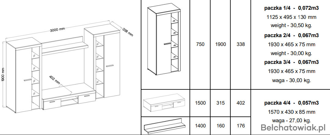 Meblościanka Rumba XL (Zdjęcia 7,8,9,10,11,12) :(szerokość 300cm,wysokość 190cm,głębokość 40,5cm)