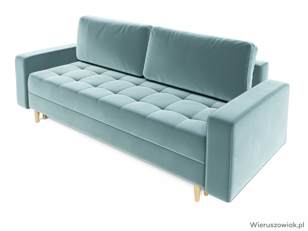 Sofa opiera się na solidnych, drewnianych stożkowych nóżkach, które nie tylko dodają jej nowoczesnego charakteru, ale także zapewniają stabilność. Tkaniny użyte do jej produkcji łączą estetykę z łatwością w pielęgnacji, gwarantując trwałość oraz komfort użytkowania.