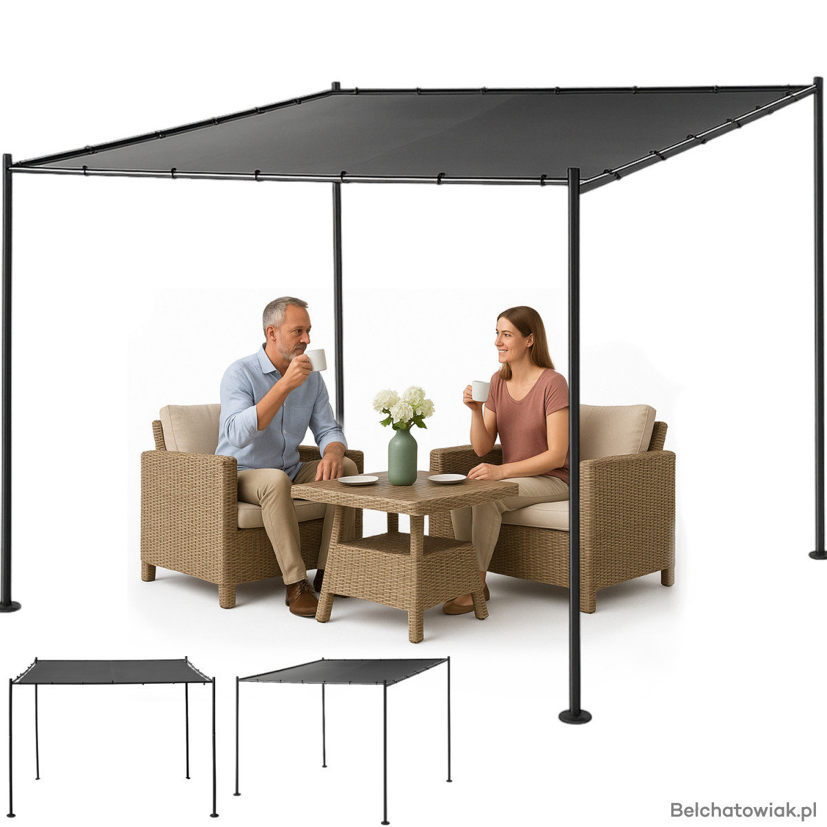 Solidna konstrukcja wykonana ze stali gwarantuje wytrzymałość, odporność na korozję oraz stabilność przez wiele lat użytkowania. Czarna powłoka pergoli nadaje jej nowoczesny i uniwersalny charakter, który wpisuje się w różne style aranżacji zewnętrznych.