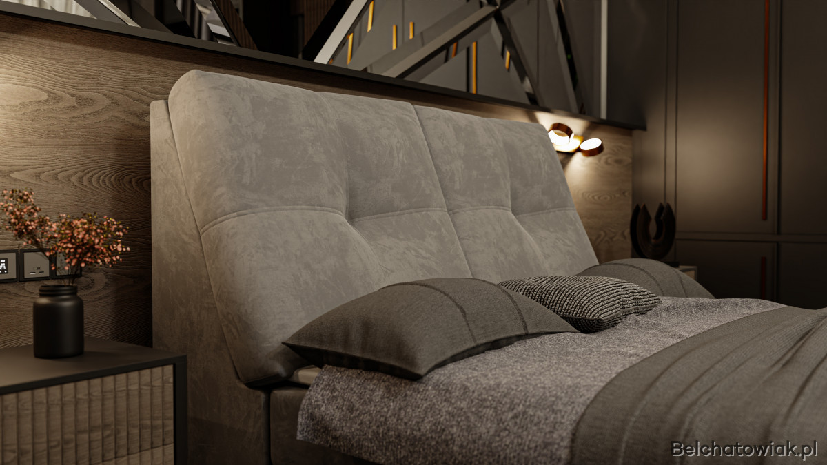 Skośny zagłówek nadaje łóżku nowoczesnego charakteru i wyjątkowej elegancji. Starannie dobrane materiały oraz precyzyjne wykończenie sprawiają, że łóżko staje się nie tylko miejscem do snu, lecz również ozdobą każdej sypialni.