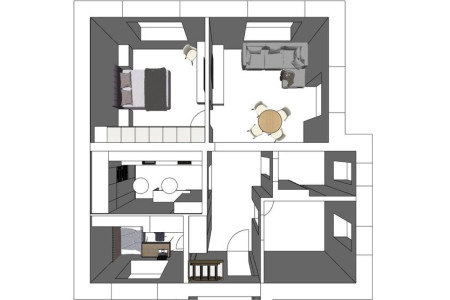 Składa się z salonu, 3 sypialni, kuchni, łazienki.