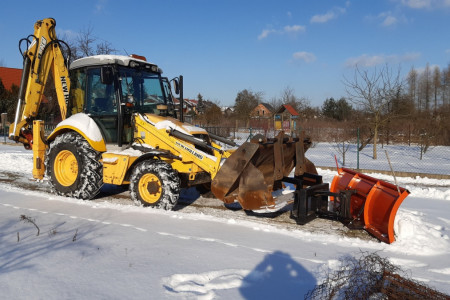 Pług o prostej konstrukcji z ramką do koparko ładowarki New Holland montowany w miejsce wideł.