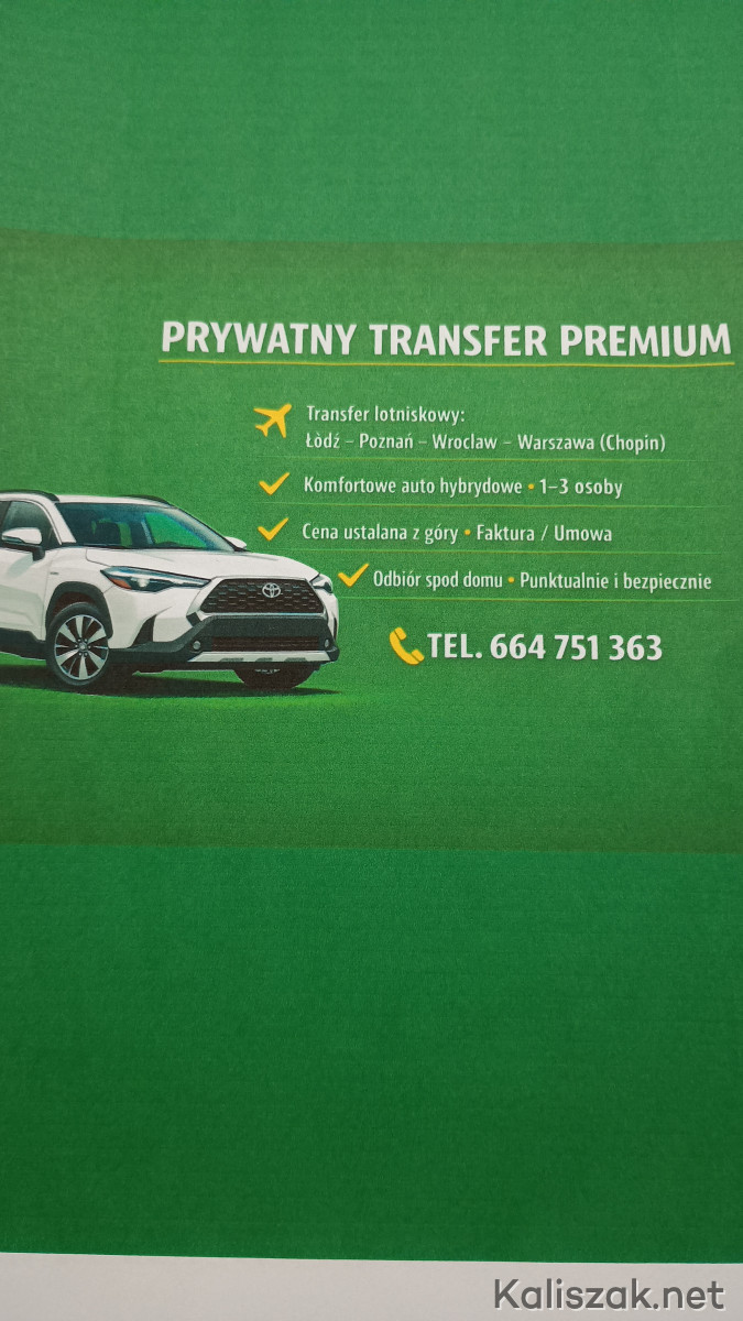 WITAM OFERUJĘ BEZPIECZNY I WYGODNY TRANSPORT Z KIEROWCĄ POSIADAJĄCYM 30 LAT DOŚWIADCZENIA, Z POD DRZWI POD WSKAZANY ADRES. ZAPEWNIAM MIŁĄ ATMOSFERĘ,POMOC PRZY BAGARZU ,HĘTNIE ODPOWIEM NA WIĘCEJ PYTAŃ PROSZĘ O KONTAKT 664 751 363 ZAPRASZAM