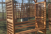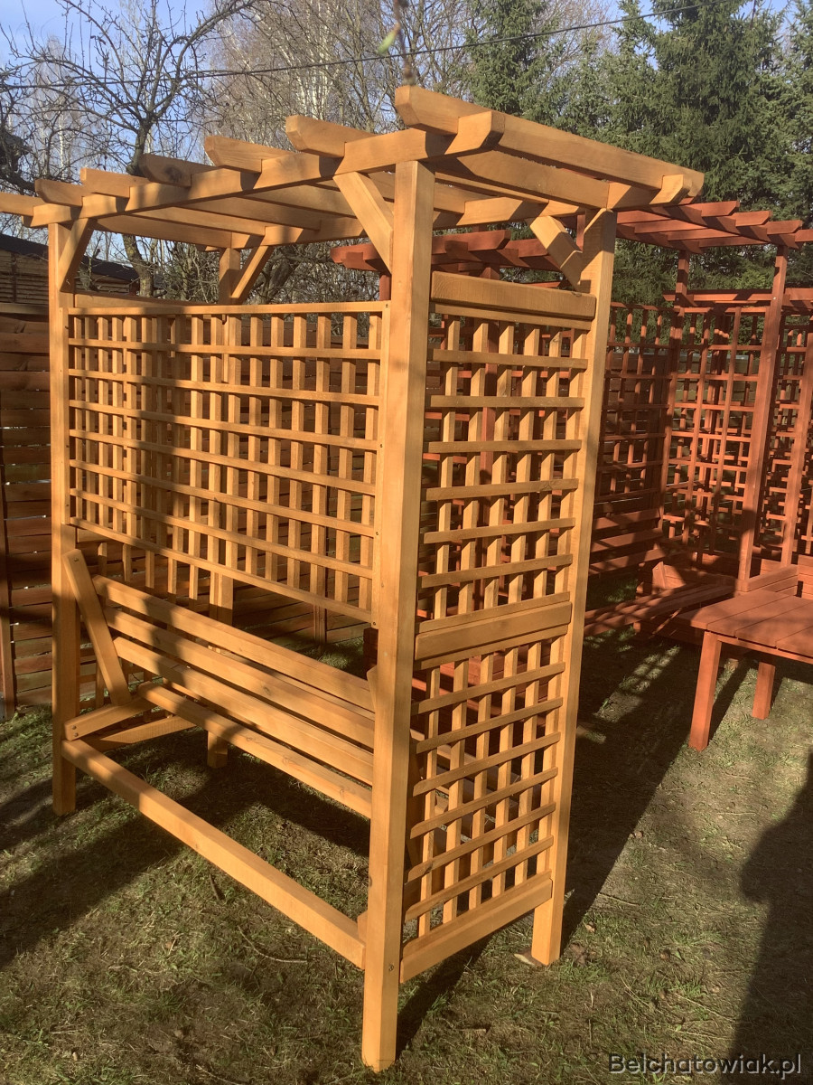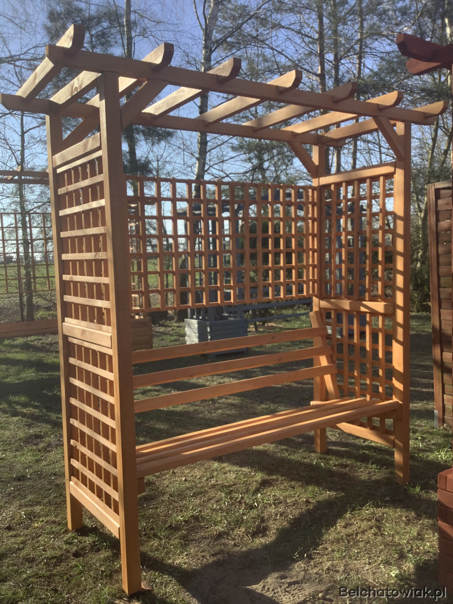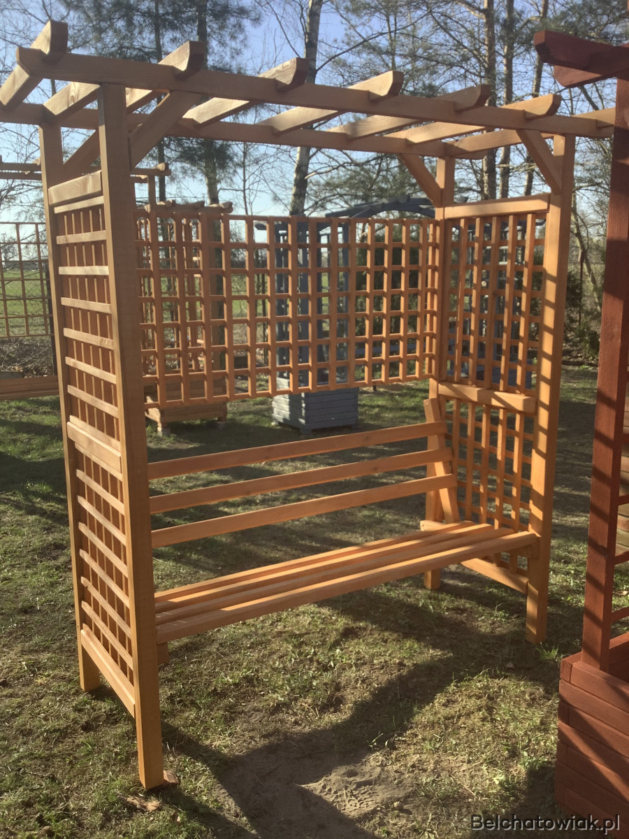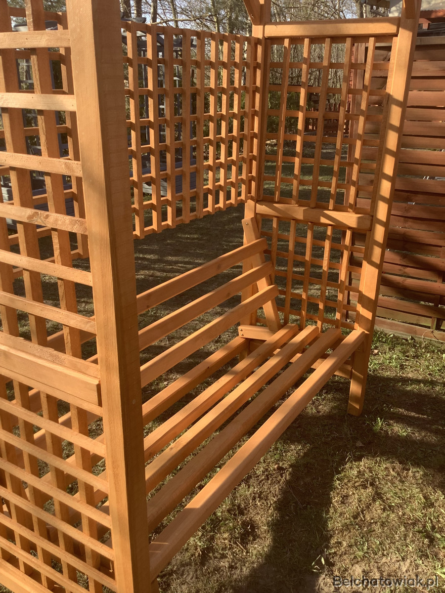 Przedmiotem sprzedaży jest wyjątkowa, wolnostojąca pergola zintegrowana z wygodną ławką, wykonana z dbałością o detale w lokalnej pracowni stolarskiej. To nie jest produkt marketowy – to solidna konstrukcja z grubego drewna sosnowego, która stanie się ozdobą Twojego ogrodu na lata.